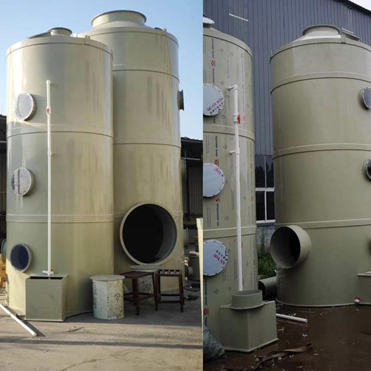 喷淋塔废气处理错流工艺流程,即水雾通过填料层回到洗涤塔底部水箱回收,洗涤安装自动搅拌加药系统,自动检测中和液酸碱,根据中和液浓度自动加药,使中和液保持一定酸(碱)状态,不会因中和液偏差引起废气处理效果不均匀或泄漏处理。废气自下而上通过填料层循环吸收剂,通过喷塔顶部的液体分布器均匀喷入填料层,沿填料层表面向下面流动,进入循环水箱。然而,由于上升气体和下降吸收剂在填料中不断接触,上升气流中质浓度会越来越低,从而达到塔顶的排放要求。