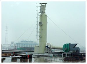 未被吸收的酸性气体继续上升进入级喷淋段。在喷淋段中由喷嘴形成的无数细小吸收液雾滴与气体混合接触,继续进行化学反应。然后上升到第二级填料段、喷淋段,进行与级同样的处理过程。第二级与级喷嘴密度不同,喷淋液压力不同,吸收反应的强度及范围也有所不同。在喷淋段及填料表面气液两相接触反应过程,是传热与传质的过程。通过控制空塔流速及滞留时间保证这一过程的充分与稳定。对于化学活性较高的酸性气体,采用中性水吸收便可达到足够的净化效率,而对于某些活性活泼性较差的物质,尚需在吸收液中加入一定量的表面活性剂,在塔体上部件设有雾段,气体中夹带的吸收液雾滴在这里被清除下来。经处理后的清洁空气从净化塔上端排入大气